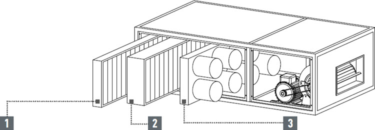 | Pirminis oro filtras – G3 klasė Filtruojanti medžiaga: poliesteris su banguota struktūra, užtikrinanti efektyvų oro srautą ir dalelių sulaikymą. Filtravimo efektyvumas: gravimetrinis testas pagal ASHRAE 52-76 (STD) / EUROVENT 4/5 standartus. Efektyvumas: 84 %, atitinka G3 klasę. Konstrukcija: tvirtas rėmas iš cinkuoto plieno lakšto. Poliesterio medžiaga sutvirtinta cinkuotais laikikliais, kurie užtikrina stabilumą ir ilgaamžiškumą. |